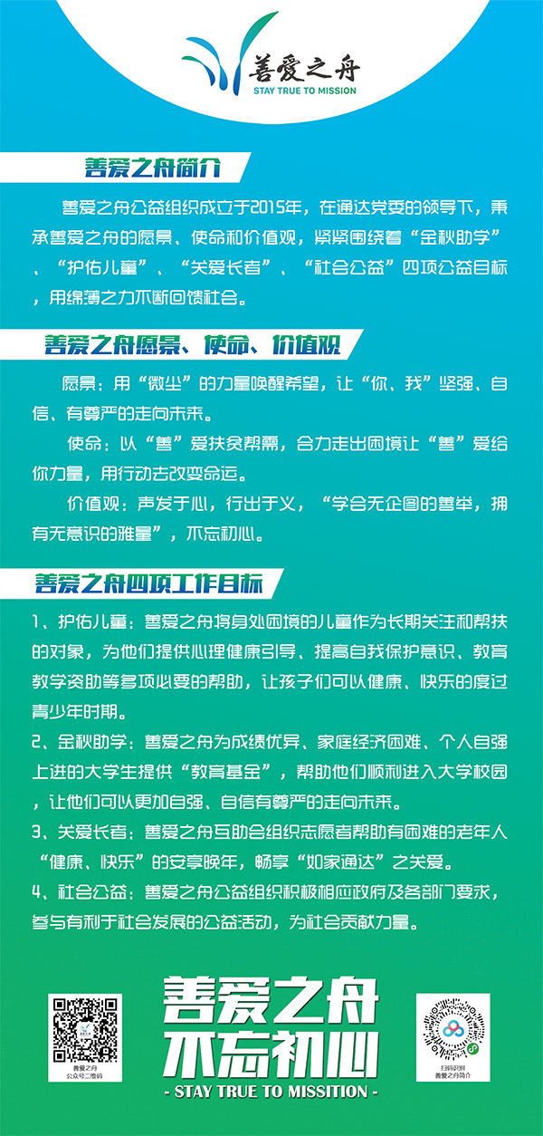 關注善愛(ài)之舟公衆号,點擊菜單欄助學報(bào)名——助學報(bào)名通(tōng)道(dào),閱讀(dú)助學海(hǎi)報(bào)了(le)解♣善愛(ài)之舟及2020年(nián)善愛(ài)之舟金(jīn)秋圓夢公益助學說(shuō)明(míng)