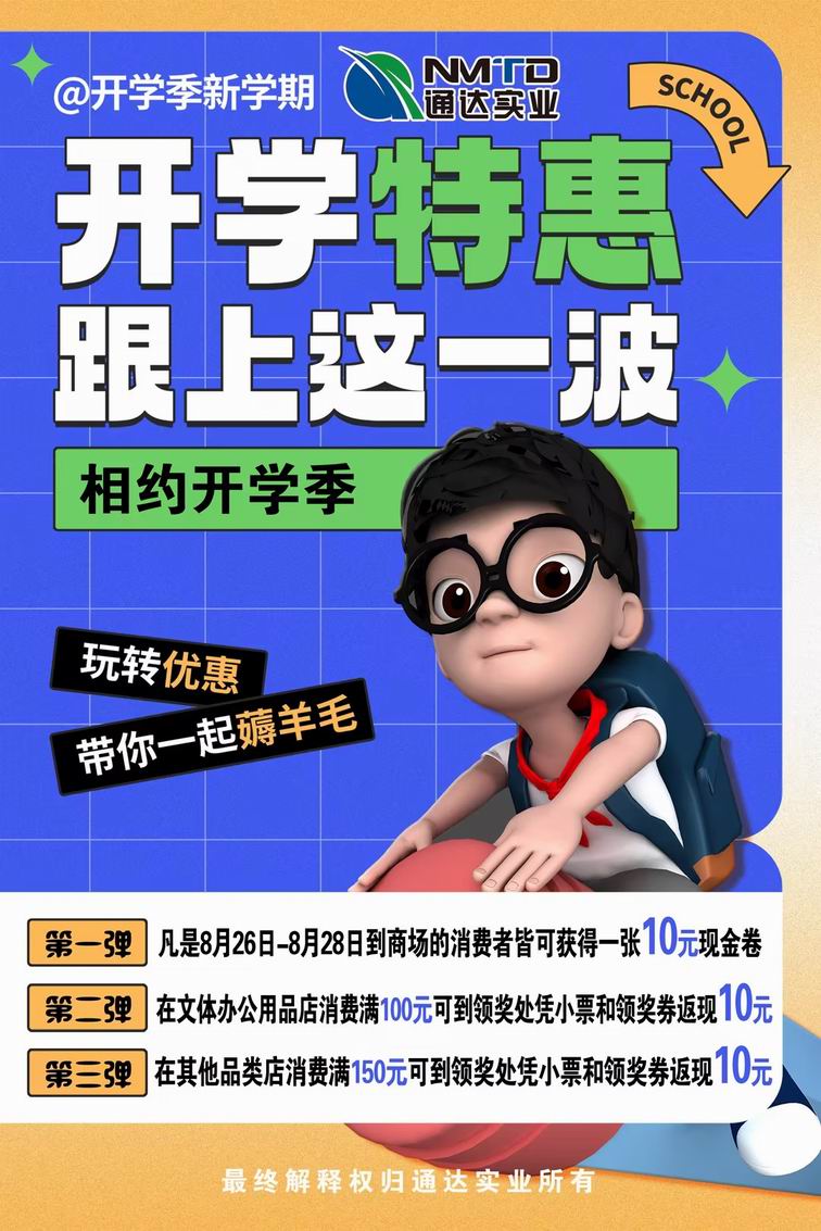 9月(yuè)臨近(jìn),又(yòu)迎來(lái)一(yī)年(nián)開(kāi)學的(de)日(rì)子(zǐ)。✔每一(yī)年(nián)的(de)開(kāi)學,令衆多(duō)學子(zǐ)向往,充滿希翼和(hé)對(duì)未知(zhī)的(de)渴望,它開(kāiα)啓了(le)童年(nián)、少(shǎo)年(nián)、青年(nián)的(de)求知(zhī)夢想,記錄了(le)稚嫩、豆蔻、青≠蔥的(de)歲月(yuè)年(nián)華。8月(yuè)底,通(tōng)達商場(chǎng)推出開(k≈āi)學季促銷活動,全商場(chǎng)特賣一(yī)降到(dào)底,新學期用(yòng)品推出特價,為↕(wèi)學子(zǐ)獻上(shàng)開(kāi)學大(dà)禮。